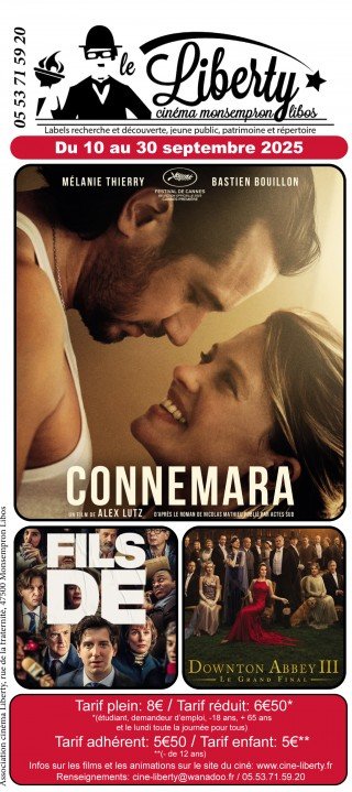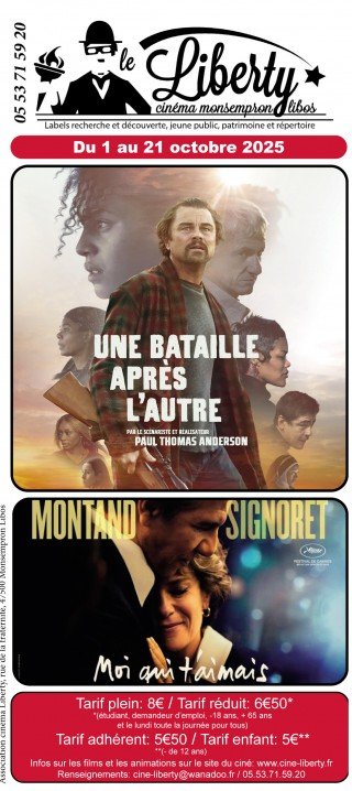 Association ciné liberty, Rue de la Fraternité, 47500 Monsempron-Libos | Mentions légales | Confidentialité | Contact | Tel : 05 53 71 59 20 Cinéma classé art et essai, labélisé jeune public, patrimoine et répertoire, recherche et découverte